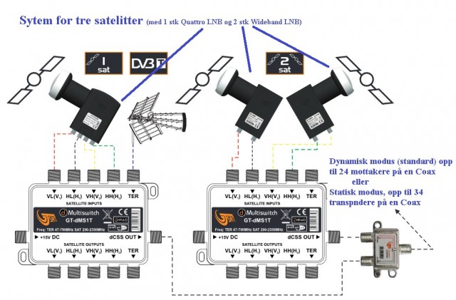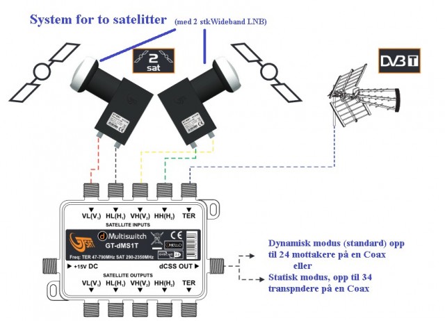 Flere kombinasjonsmuligheter bla kan du ved å bygge ut systemet få opp til 4 satelitter på EN coax kabel.