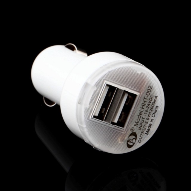 Med dobbel usb uttak. Inn: 12V - 24V DC Ut: 5V / 2.1A